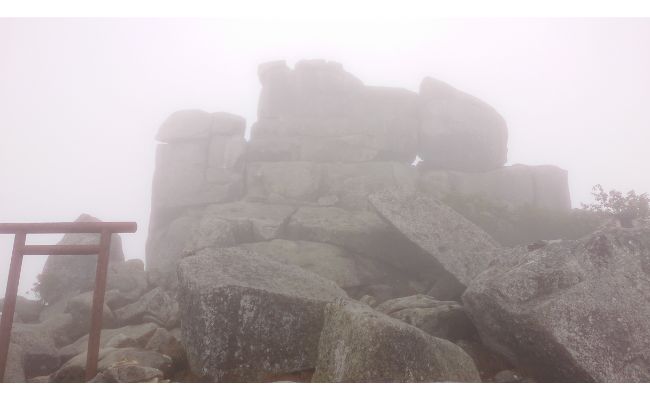 虚無です。私が山頂につく15分前は晴れていました。なのに・・なぜ虚無なの。有名な大きな岩もありますが、虚無過ぎてなんだからわかりません。